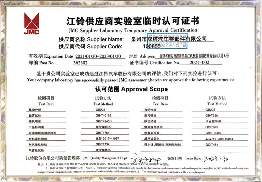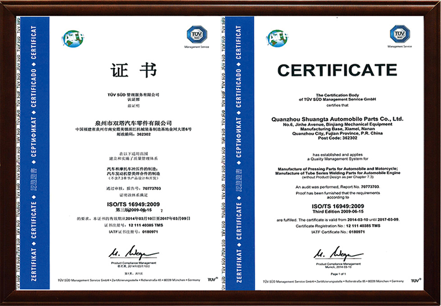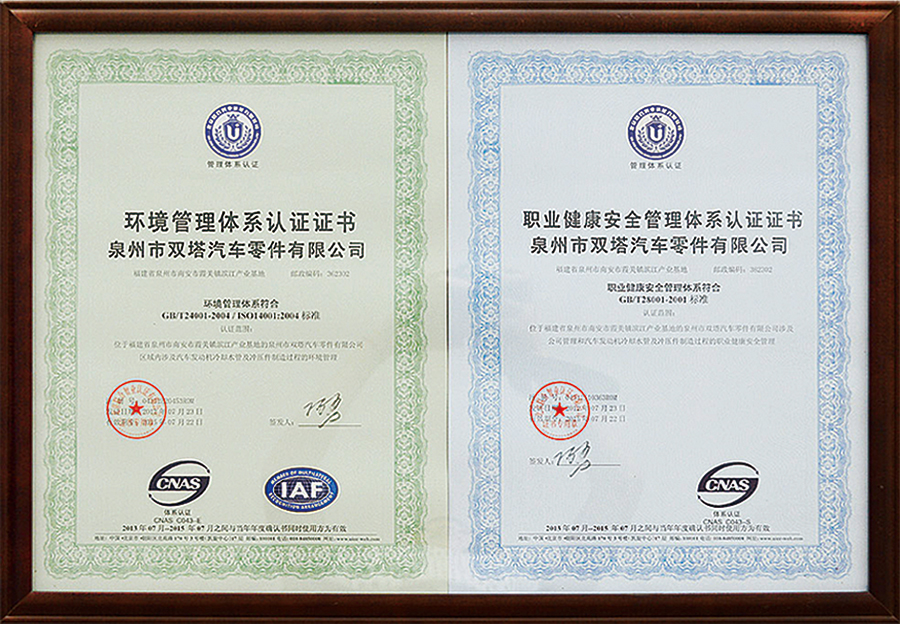 Shuangta Enterprise has established a quality management system based on the TS16949 standard for the automotive industry, and actively promotes the implementation of the ISO14001:2004 environmental management system and the OHSAS 18001:2007 occupational health and safety management system. Through system extension, the quality control of auto parts products has expanded from the traditional production quality control of suppliers by OEMs to raw material suppliers and auxiliary parts suppliers, fully covering the quality system from component suppliers, outsourced production processes to on-site services, so as to ensure full-process quality control.